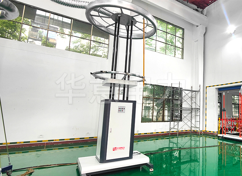 電動升降絕緣杆支架符合國標DL/T 1476-2023《電力安全工器具預防性試驗規程》要求。適用於110~220kV電壓等級絕緣杆整體試驗,絕緣杆耐壓支架采用圓形結構,一次可以進行8隻絕緣杆的測試。下部接地環可以上下電動移動調節試驗長度。測試係統由主控試驗台,無局放試驗變壓器,分壓器,金屬保護電阻等升壓設備,和遙控耐壓升降平台組成;遙控耐壓升降平台采用絕緣門式結構,門架中間安裝有吊裝小車,可以將絕緣杆吊起進行耐壓試驗。